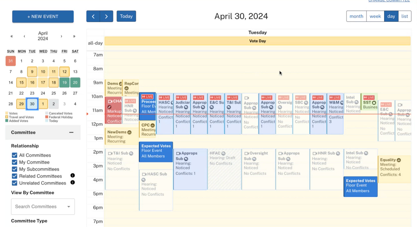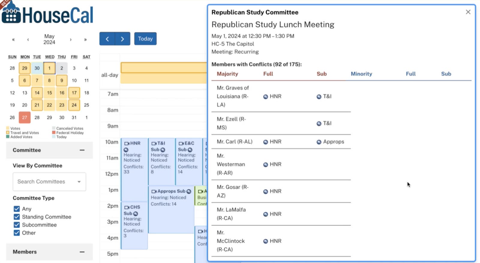 The core functionality of HouseCal lies in its ability to aggregate data from multiple sources into a single, unified calendar view. While HouseCal draws heavily from the foundational features of 'Deconflict,' such as real-time conflict detection and integration of committee schedules with rosters, it expands on these functionalities to serve a broader audience. Unlike 'Deconflict,' which is used primarily for internal planning and coordination within the majority party, HouseCal is designed to offers accessibility to all members of Congress and their staff.