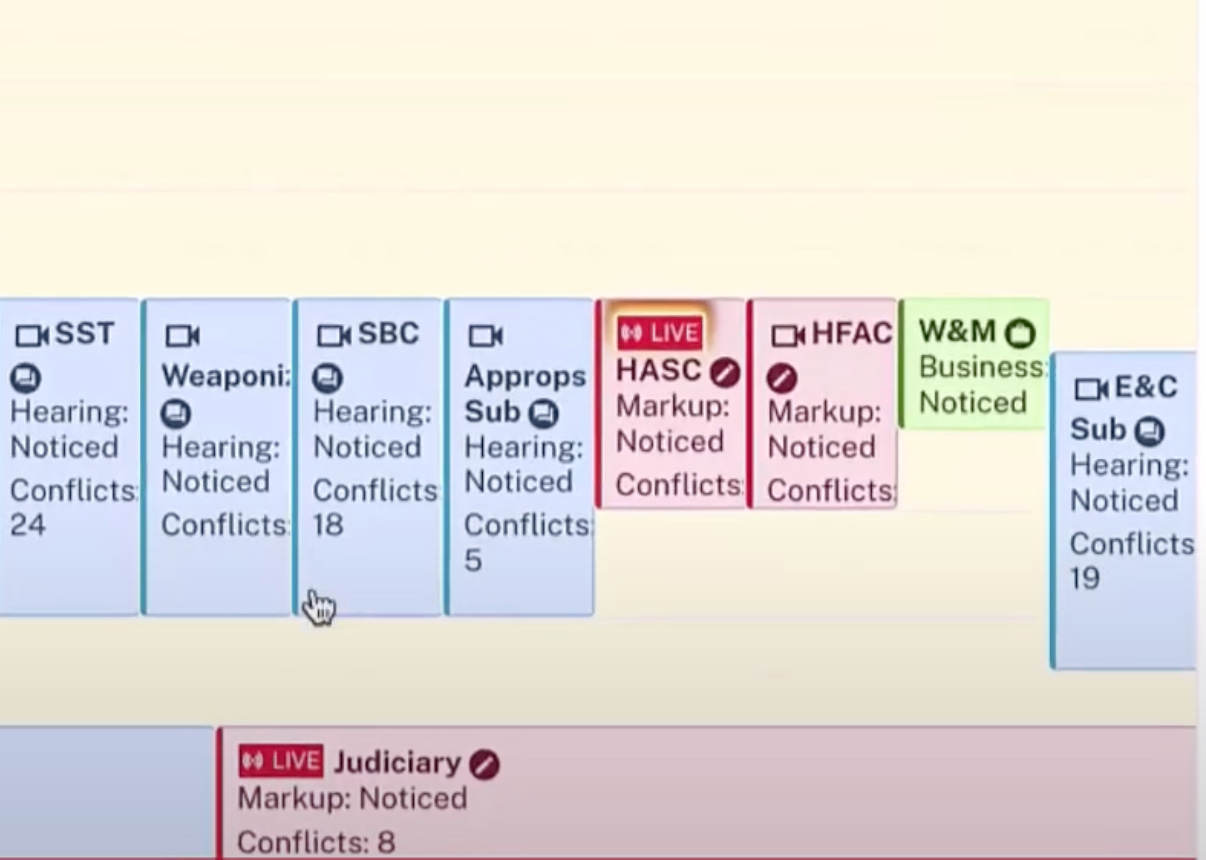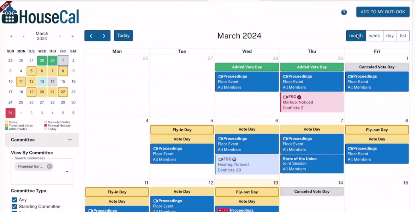 The primary function of HouseCal is to aggregate scheduling data from multiple sources, including the committee repository and leadership inputs, and present this data in an accessible and user-friendly format. This functionality not only streamlines the scheduling process but also offers features such as real-time updates, conflict detection, video integration, and synchronisation with personal calendars via Outlook. These capabilities ensure that all stakeholders, from Members of Congress to their aides, have up-to-date and accurate information on their commitments and legislative activities.